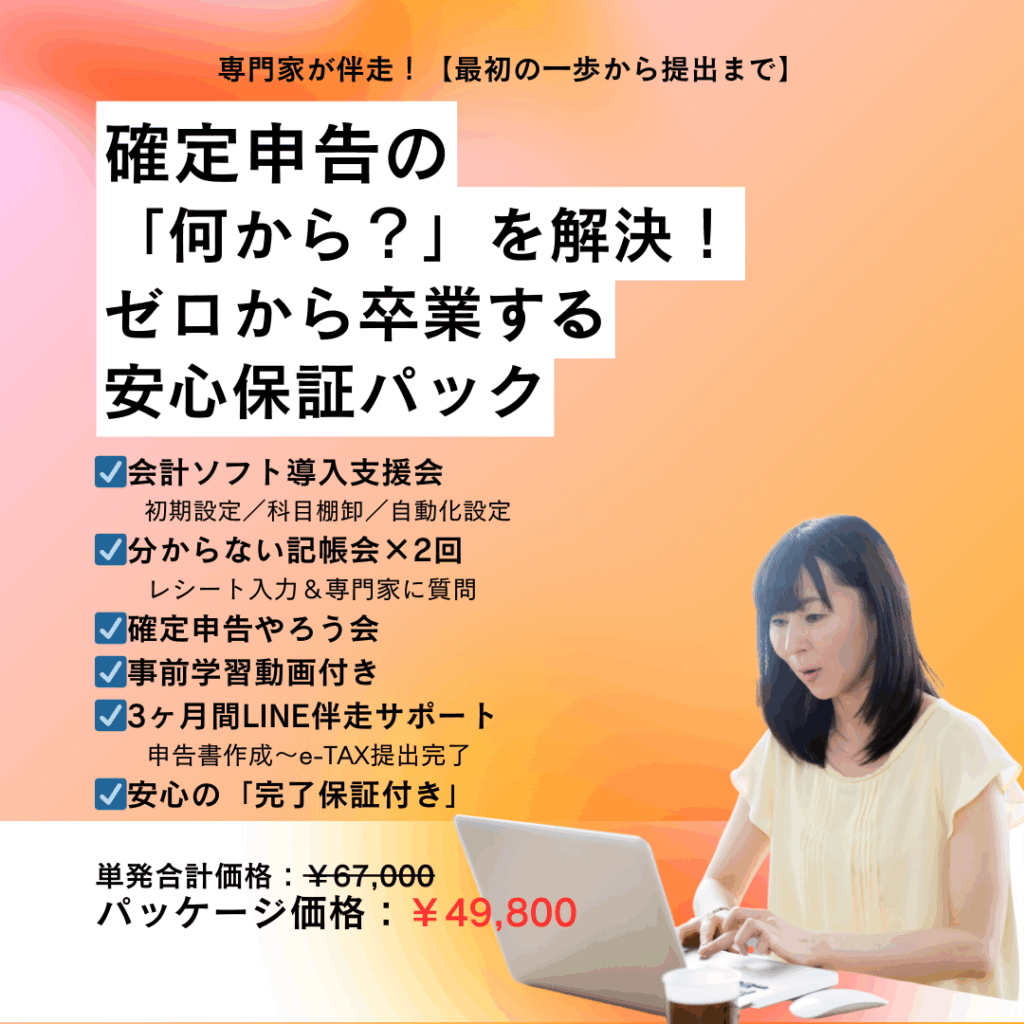 「確定申告の何から手をつけるべきか?」「本当にこれで合っているのか?」という不安を、3ヶ月間の徹底した伴走サポートで完全に解消します。